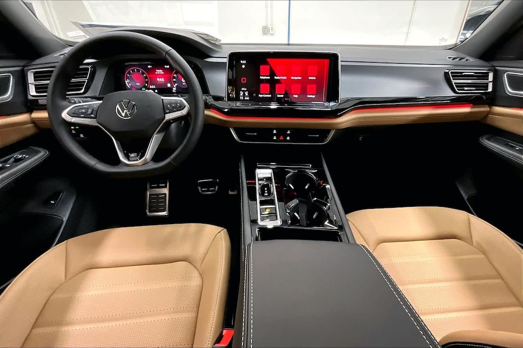 - 20 black painted alloy wheels w/ all-season tires- LED automatic headlights, Daytime Running Lights & taillights- Adaptive Front Lighting System (AFS)- Poor Weather Lights (improves visibility in inclement weather)- Front & rear light bars; illluminated front & rear Volkswagen logos- Side mirrors w/ position memory- Rain-sensing front wipers w/ heated washer nozzles- Power tilting & sliding panoramic sunroof- R-Line® grille & exterior trim w/ black accents; roof rails- Trailer hitch (5,000 lb. towing capacity)- Climatronic® Touch dual-zone automatic climate control- Heated, leather-wrapped R-Line® steering wheel w/ shift paddles- Heated & ventilated, power drivers seat w/ lumbar support & position memory- Heated & ventilated, power front passenger seat- Rear seat: 60/40 split-folding, w/ center armrest- Heated rear seat (outboard seating positions)- Leather seating surfaces (1st row & outboard 2nd row)- Auto-dimming rearview mirror w/ HomeLink® (Smart Home App at homelink.com)- 115V AC outlet in 2nd row; front & rear USB-C ports; 12V power port in cargo area- Roll-up manual sunshades for 2nd-row windows- Multi-color adjustable ambient lighting; front entry lighting; front footwell lights